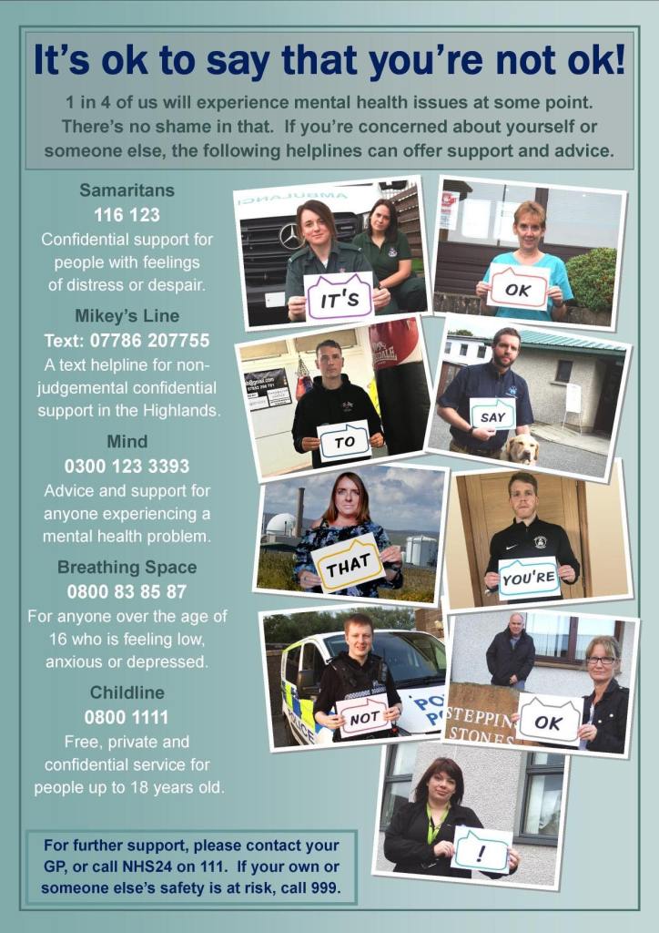 Mental Health Support We are living in difficult times, talk to someone, you are not alone. Here are some groups that can support you. Contact details: Samaritans 116 123 Mikey’s Line 07786 207755 Mind 0300 123 3393 Breathing Space 0800 83 85 87 Childline 0800 1111 NHS24 111 Share this: Share on X (Opens in new window) X Share on Facebook (Opens in new window) Facebook Like Loading...